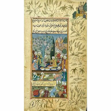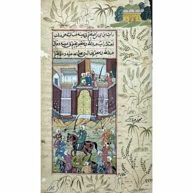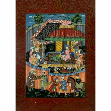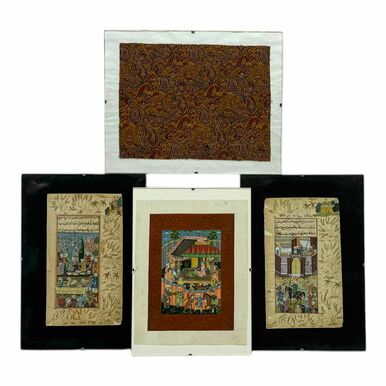 1) Audience with the Sultan, mixed media on silk, good age-appropriate condition, image 19.5 x 14.5 cm (HxW), framed behind glass, overall dimensions 28 x 20 cm (HxW) 2) Two miniatures, mixed media on paper with writing, siege in front of the city gate and a feast, age-appropriate condition, worm-eaten right into the depiction, backed with paper, image each 22 x 13 cm (HxW), framed behind glass, overall dimensions each 29.5 x 21 cm (HxW) 3) Fabric sample from the Middle East, canopic decoration in fine brown tones, good condition, 25.5 x 19.5 cm (HxW), framed behind glass, overall dimensions 30 x 24 cm (HxW)